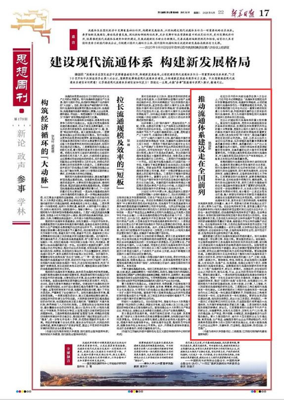 9月22日,校党委书记姚冠新在《新华日报》“思想周刊”发表题为《推动流通体系建设走在全国前列》的署名文章。文章从充分认识建设现代流通体系的重大现实意义,准确把握现代流通体系的科学内涵和现实差距,精准厘清江苏现代流通体系建设的思路和重点等3个方面,深入阐述了推进现代流通体系建的重要意义和江苏推进现代流通体系建设的科学路径。
